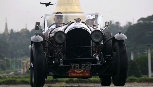 Sebuah mobil klasik dari Bentley 1928 berhenti di depan pagoda Shwedagon sata mengikuti acara "Burma Road Classic" di Yangon, Myanmar, (28/10). Sekitar 20 mobil klasik dari Myanmar dan dari seluruh dunia ikut berpartisipasi dalam turing selama 17 hari. REUTERS/Soe Zeya Tun
