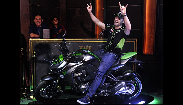 Juara dunia World Superbike (WSBK) tahun 2013, Tom Sykes berpose di atas Kawasaki Z1000 saat peluncuran sepeda motor tersebut di Jakarta, (28/2). ANTARA/Andika Wahyu