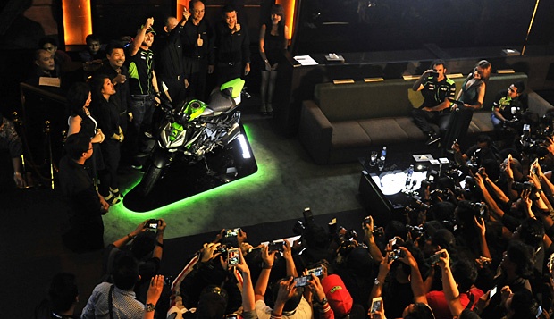 Suasana peluncuran sepeda motor kelas premium terbaru Kawasaki Z1000 saat peluncurannya di Jakarta, (28/2). Juara dunia World Superbike (WSBK) tahun 2013, Tom Sykes hadir dalam peluncuran sepeda motor tersebut. ANTARA/Andika Wahyu