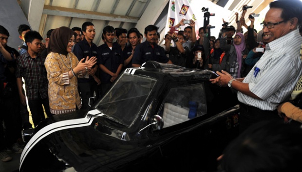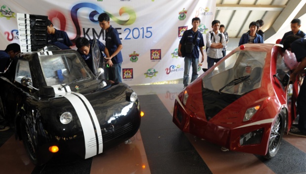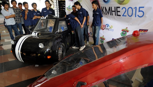 Tiim Anging Mammiri Fakultas Teknik Universitas Hasanuddin memperlihatkan dua mobil hemat energi karyanya di Rektorat Kampus Unhas, 15 Oktober 2015. TEMPO/Hariandi Hafid