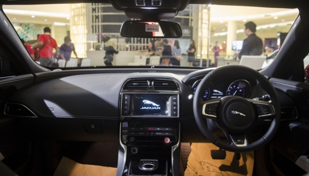 Interior mobil Jaguar XE saat dipamerkan di Senayan City, Jakarta, 19 Februari 2016. Interior Jaguar XE terlihat mewah dan lapang dengan balutan kulit, veneers, serta metal finishers. TEMPO/Wisnu Agung Prasetyo