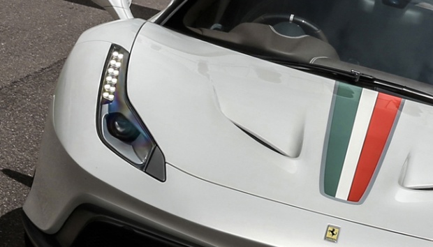 Pada tampilan, Ferrari 458 MM Speciale dibaluri dengan warna khusus Bianco Italia dengan strip warna bendera Italia dari atap hingga kap depan. topgear.com
