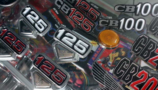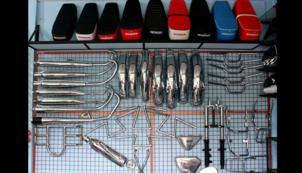 Sejumlah suku cadang dan aksesori motor tua dipajang di bengkel restorasi MRC (MR. Classic), Lenteng Agung, jakarta, (15/01). Di bengkel ini pelanggan dapat merestorasi motor tua dengan suku cadang dan aksesorinya. TEMPO/Yosep Arkian