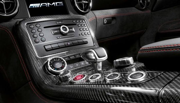 Bahan serat karbon bukan hanya pada sisi bodi luar di mobil SLS AMG Black Series ini saja tetapi juga pada sejumlah bagian interior mobil sport andalan Mercedes-Benz ini. robbreport.com