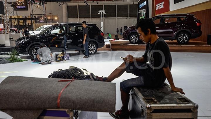 Pekerja tengah mempersiapkan area pameran kendaraan bermotor Indonesia International Motor Show (IIMS) 2018 di JiExpo Kemayoran, Jakarta, 18 April 2018. Penyelenggara memperkirakan jumlah pengunjung tahun ini diharapkan bisa menyentuh angka 528.000 orang. TEMPO/Tony Hartawan