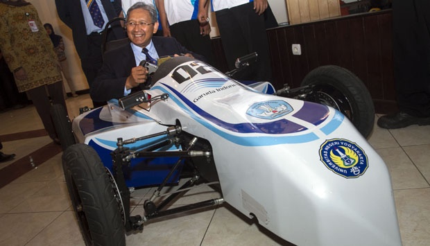 Rektor Universitas Negeri Yogyakarta, Prof. Dr. Rochmat Wahab mencoba duduk di kokpit mobil listrik UNY EVO karya tim Garuda UNY saat peluncuran di Auditorium Universitas Negeri Yogyakarta, (2/5). TEMPO/Suryo Wibowo