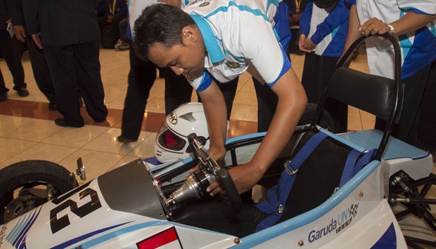 Rektor Universitas Negeri Yogyakarta, Prof. Dr. Rochmat Wahab mencobai mobil listrik UNY EVO karya tim Garuda UNY di Auditorium Universitas Negeri Yogyakarta, (2/5). TEMPO/Suryo Wibowo