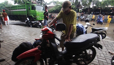 Genangan air setinggi 20 cm di depan Balai Kartini, Jakarta, menyebabkan sebuah mobil Ferrari California seri 599 GTB mogok, Minggu (19/5). TEMPO/Dian Triyuli Handoko