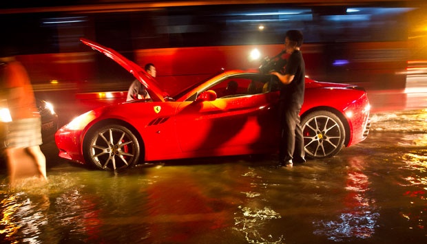 Gara-gara genagan air setinggi 20 cm, sebuah mobil Ferrari California seri 599 GTB mogok di depan Balai Kartini, Kuningan, Jakarta , Minggu (19/5). TEMPO/Dian Triyuli Handoko
