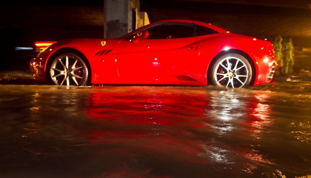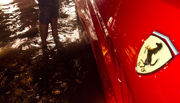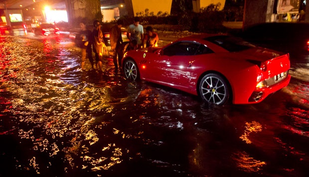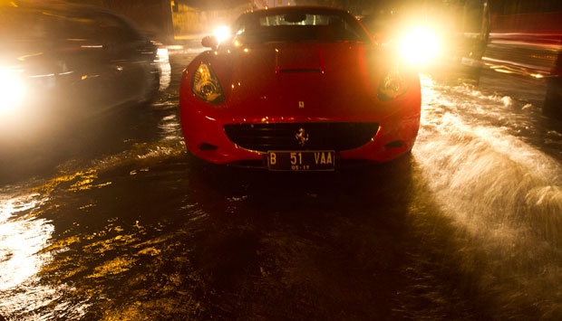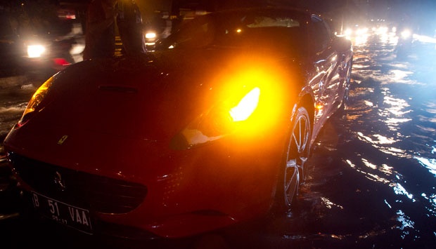Sebuah mobil Ferrari California seri 599 GTB mogok akibat terendam genangan air setinggi 20 cm di depan Balai Kartini, Kuningan, Jakarta, Minggu (19/5). TEMPO/Dian Triyuli Handoko
