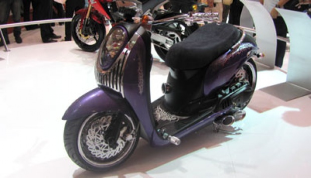 Sekilas tampilan skutik berbalur ungu itu terkesan lebih gembrot ketimbang Scoopy yang ada saat ini. Kesan gemuk itu berkat penggunaan ban, baik depan maupun belakang, yang lebih besar dan lebar dibanding ban aslinya.